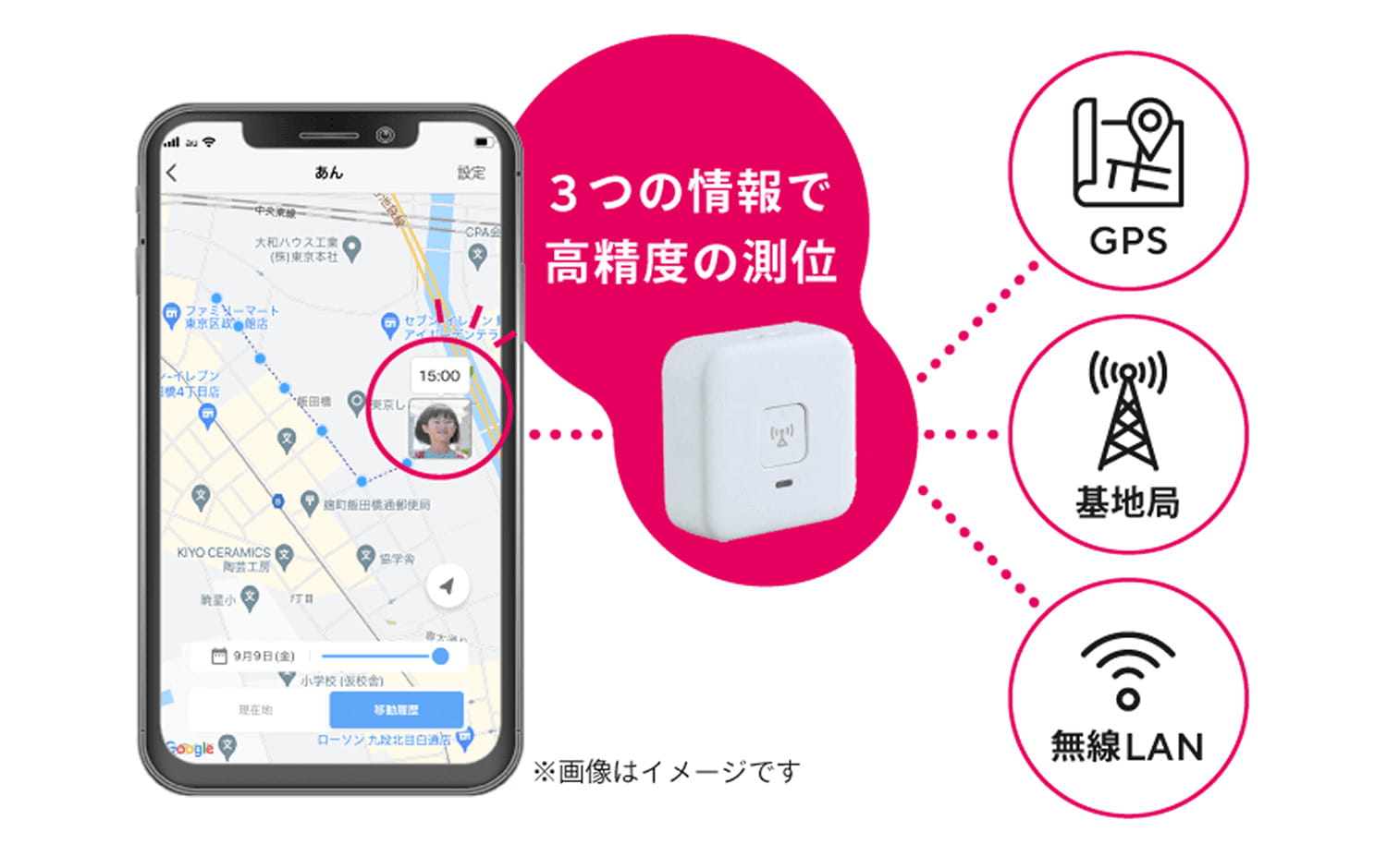 auの4G LTE通信網を利用し、GPSだけでなく、周辺の無線LANや携帯電話基地局の情報も活用して、屋内外で比較的安定した測位を実現します。