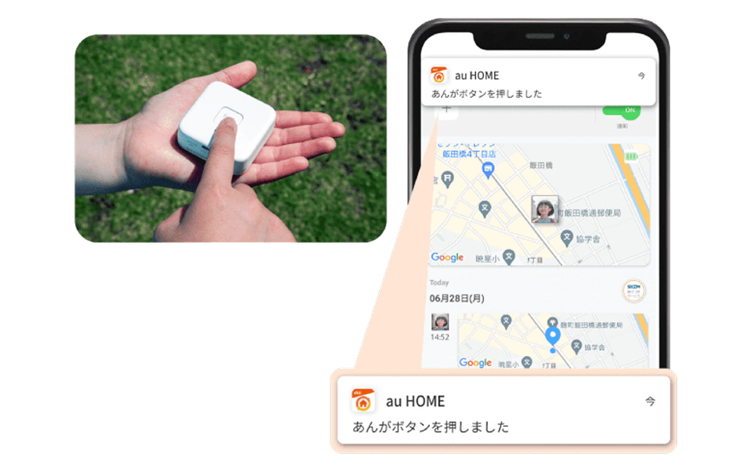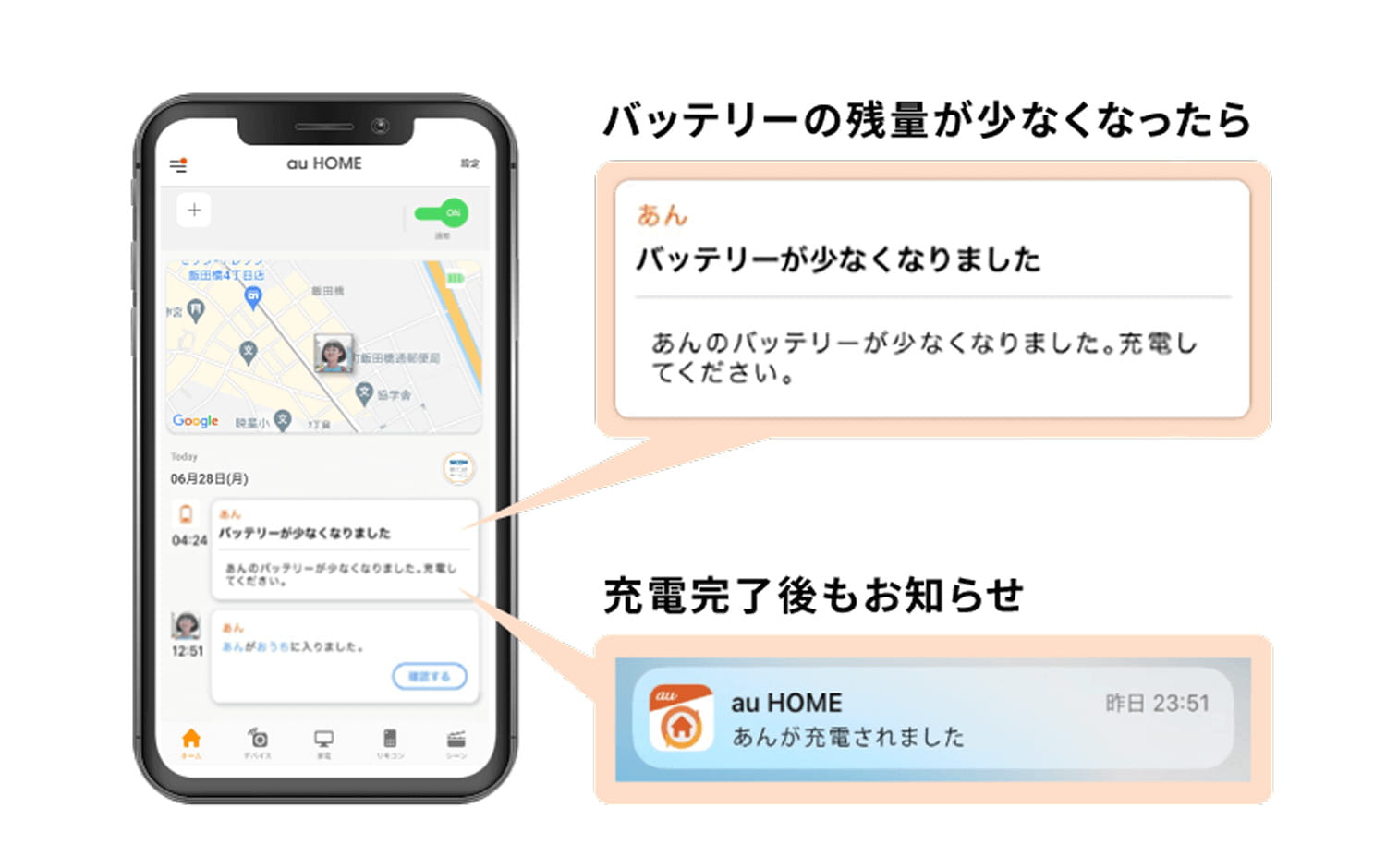また、簡単に操作できる専用スマートフォンアプリ「au HOME」で、現在地の確認、移動履歴の閲覧、各種設定が簡単に行えます。