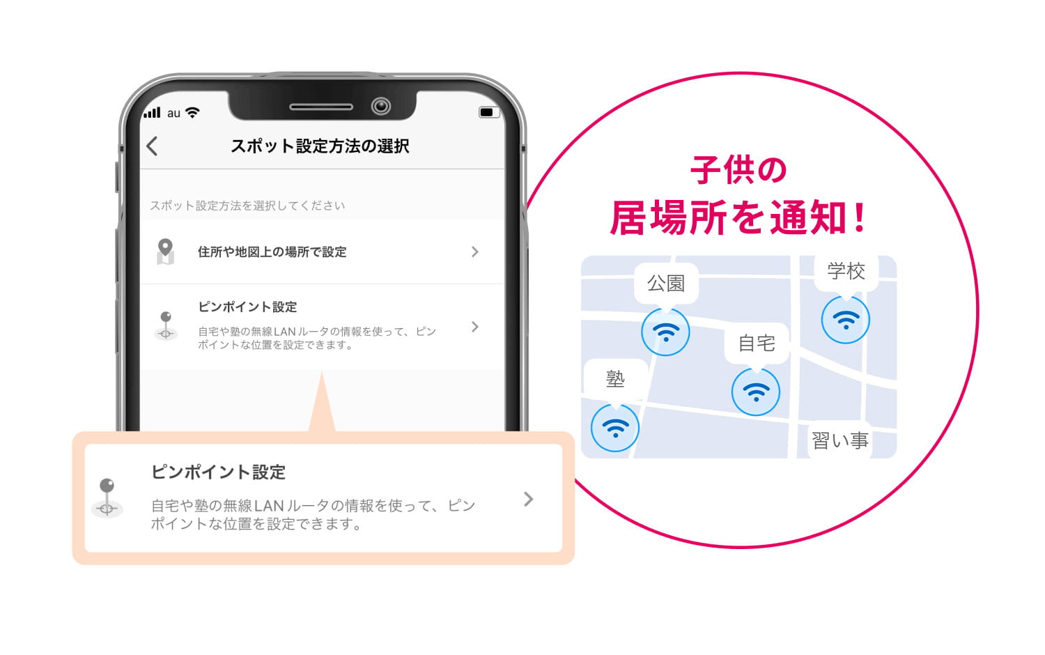 さらに、「ピンポイント設定」をすると自宅や塾の無線LANとつながった時に通知がきて、より正確に離れた・入ったことが分かる。