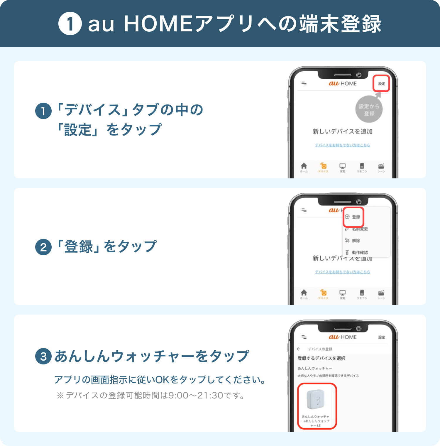 ※あんしんウォッチャーはauのLTE-M通信を使用します。設定作業は必ず通信エリア内で行ってください。対応エリアの確認はau公式サイト等で事前にチェックしておくと安心です。 また、登録受付時間は9:00~21:30となっています。