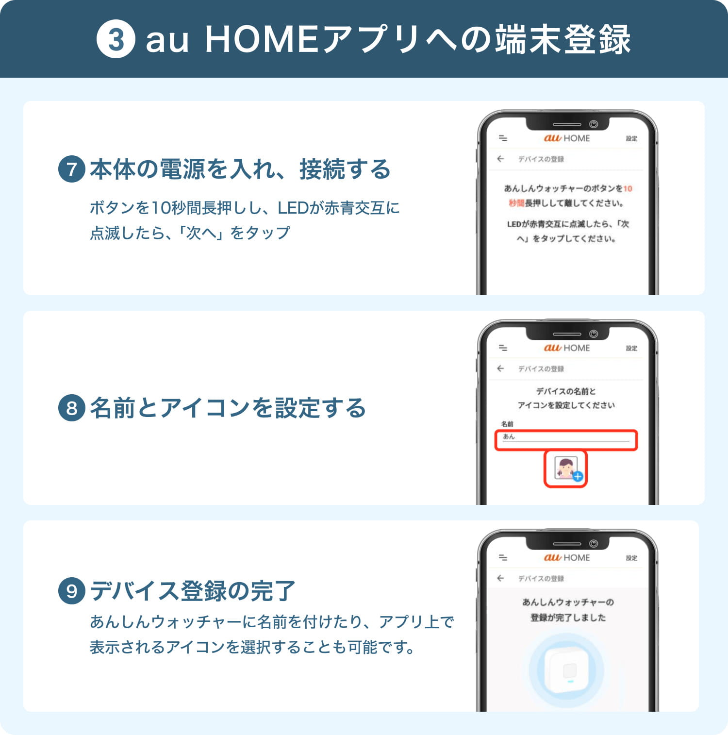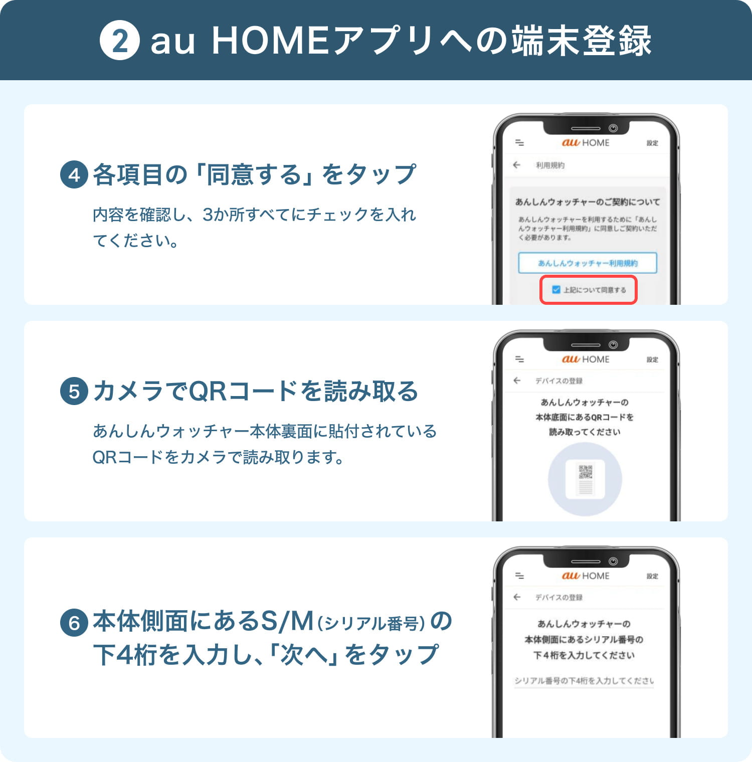 ※登録手順の詳細は、お使いのあんしんウォッチャーの機種やアプリのバージョンによって若干異なる場合があります。必ず付属の取扱説明書やau公式サイトの最新情報もあわせてご確認ください。