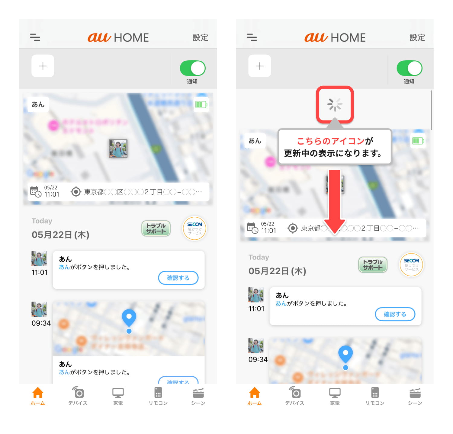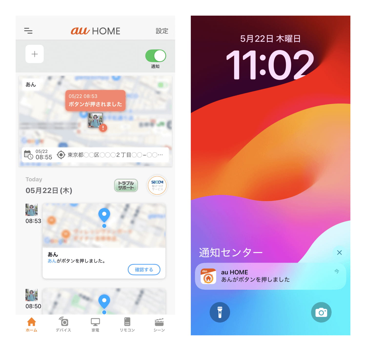 登録が完了したら、早速あんしんウォッチャーを使ってみましょう。主な操作は「au HOME」アプリで行います。