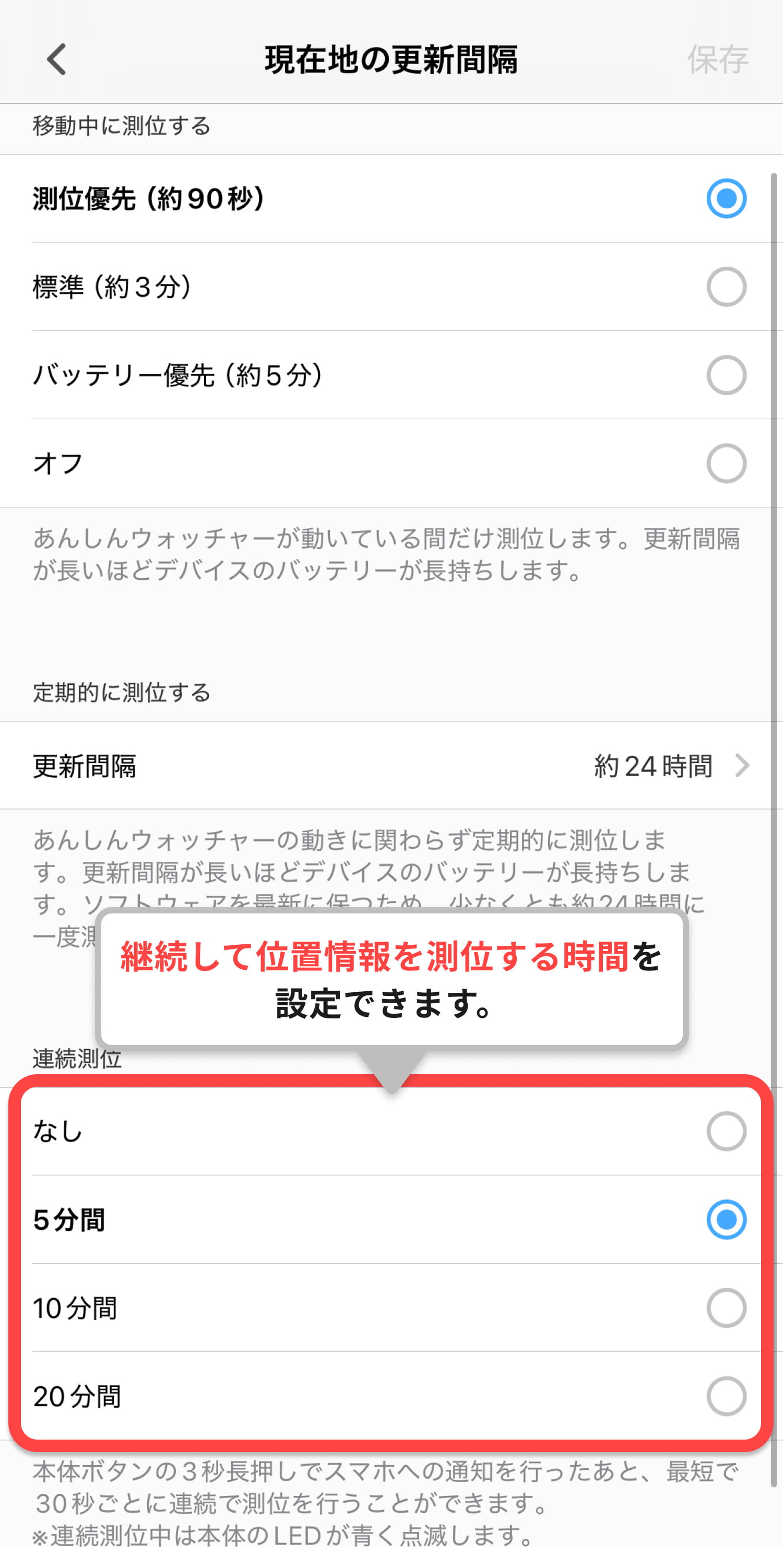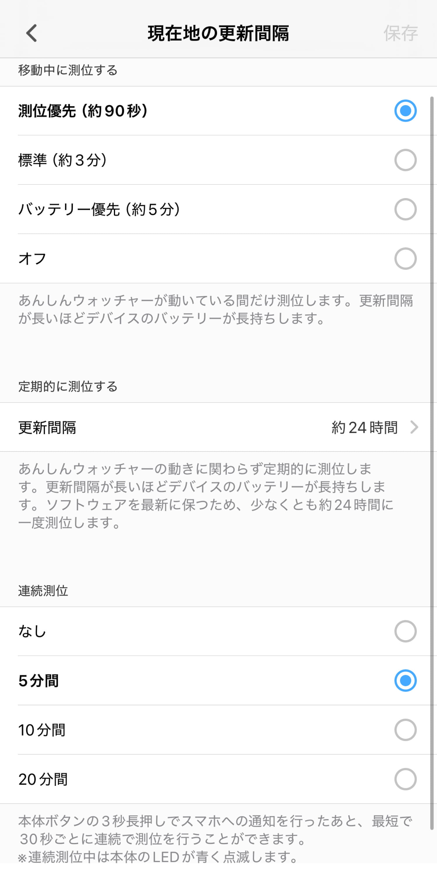 この本体ボタンが長押しされた後、継続して位置情報を測位する時間を5分、10分、20分から設定できます。もし子どもが通知ボタンを押した後に移動してしまった場合でも、設定した時間内は最短30秒ごとに位置情報を更新し続けるため、正確な位置を把握しやすくなります。
