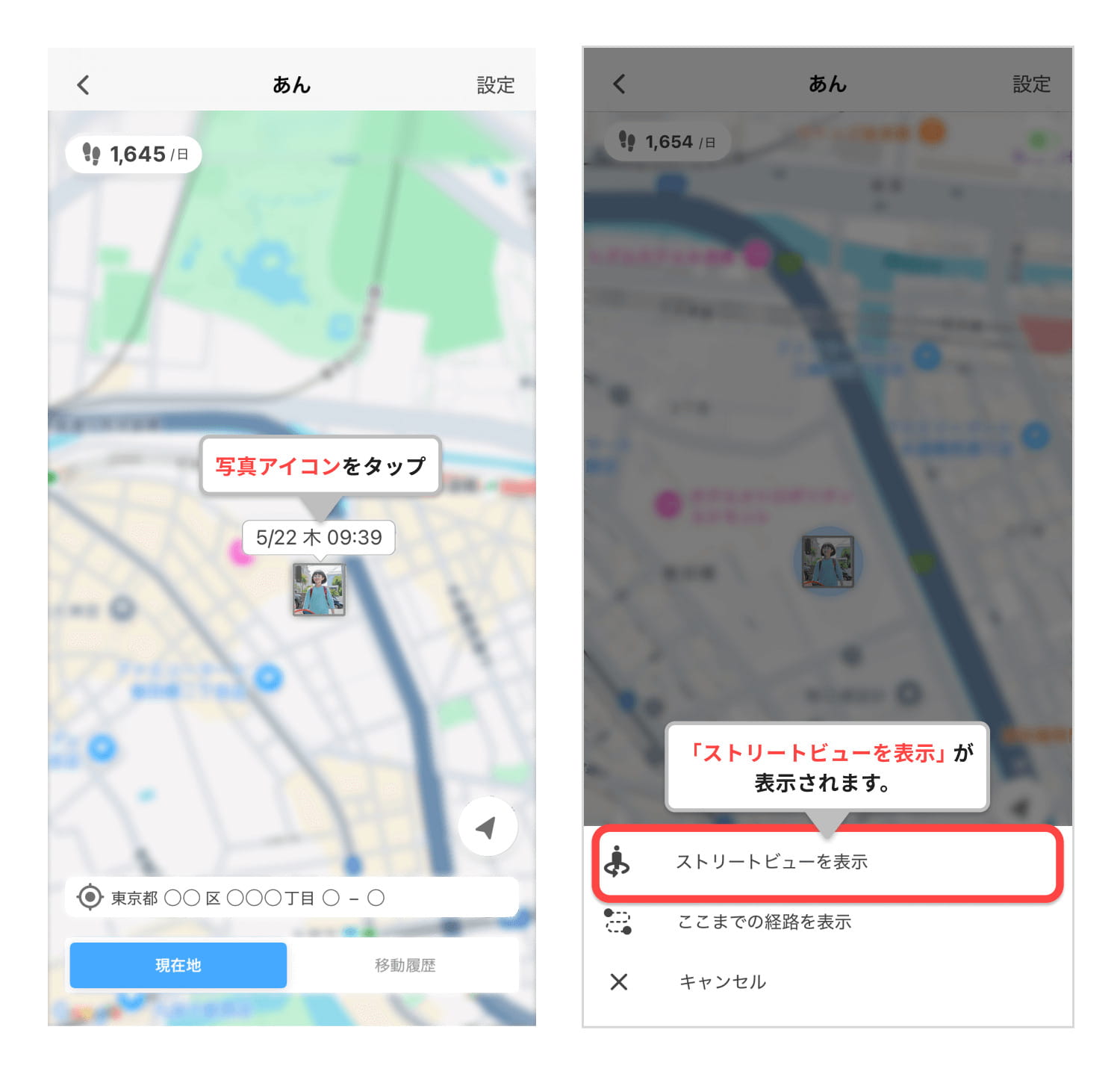 さらに、子どもがいる場所の実際の周囲環境を視覚的に確認できるため、より具体的な状況把握に役立ちます。「ここまでの経路を表示」機能を使えば、保護者(見守る側)の現在地から子ども(見守られる側)までの経路がGoogleマップで表示され、万が一の際にすぐに駆けつけたい時に非常に便利です。