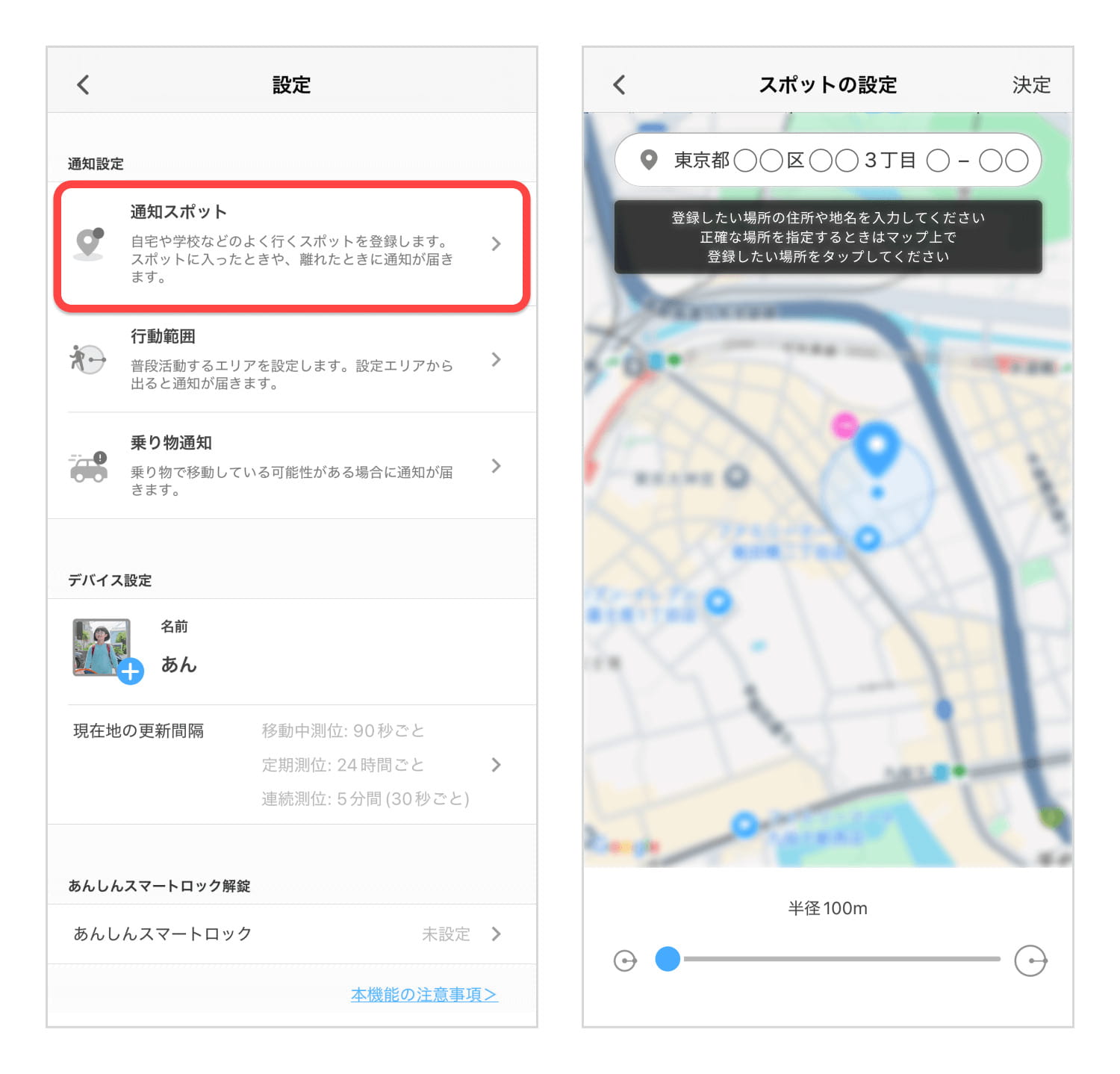 学校、塾、自宅、駅など、よく行く場所を地図上で囲んでエリアとして登録できます。その設定保護者(見守る側)のアプリにプッシュ通知が届くため、「ちゃんと学校に着いたかな?」「そろそろ塾を出る時間だけど……」といった日々の心配を軽減し、都度確認する手間が省けます。エリア設定は、住所を直接入力するか、地図上の場所を指定して行い、半径100mから500mの範囲で設定可能です。