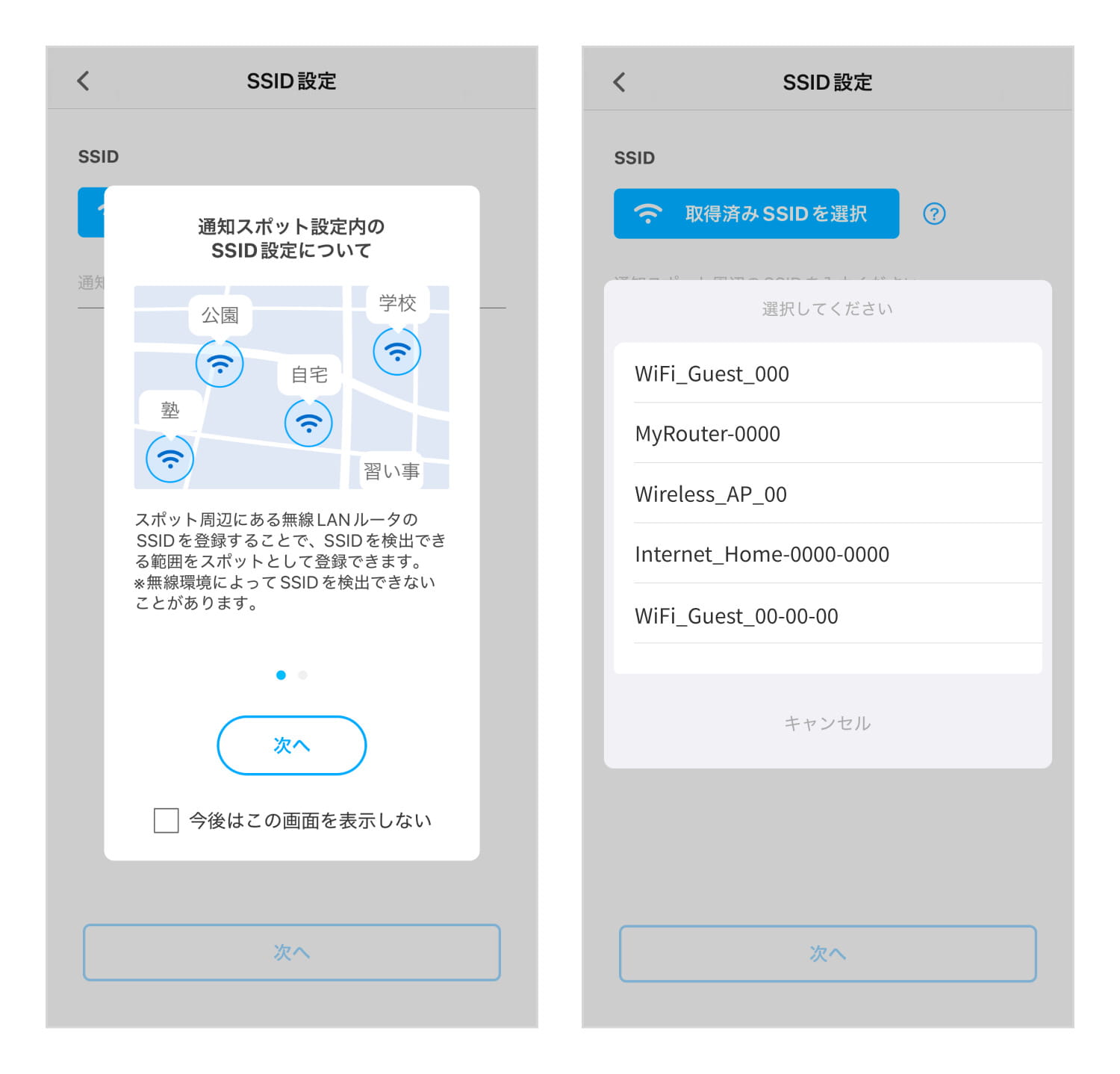 ご自宅が集合住宅で、地図上の位置だけでは正確な帰宅確認が難しい場合には、自宅の無線LANのSSIDを設定することで、その無線LANに接続された際に通知を受け取ることもでき、より確実に在宅状況を把握できます。
