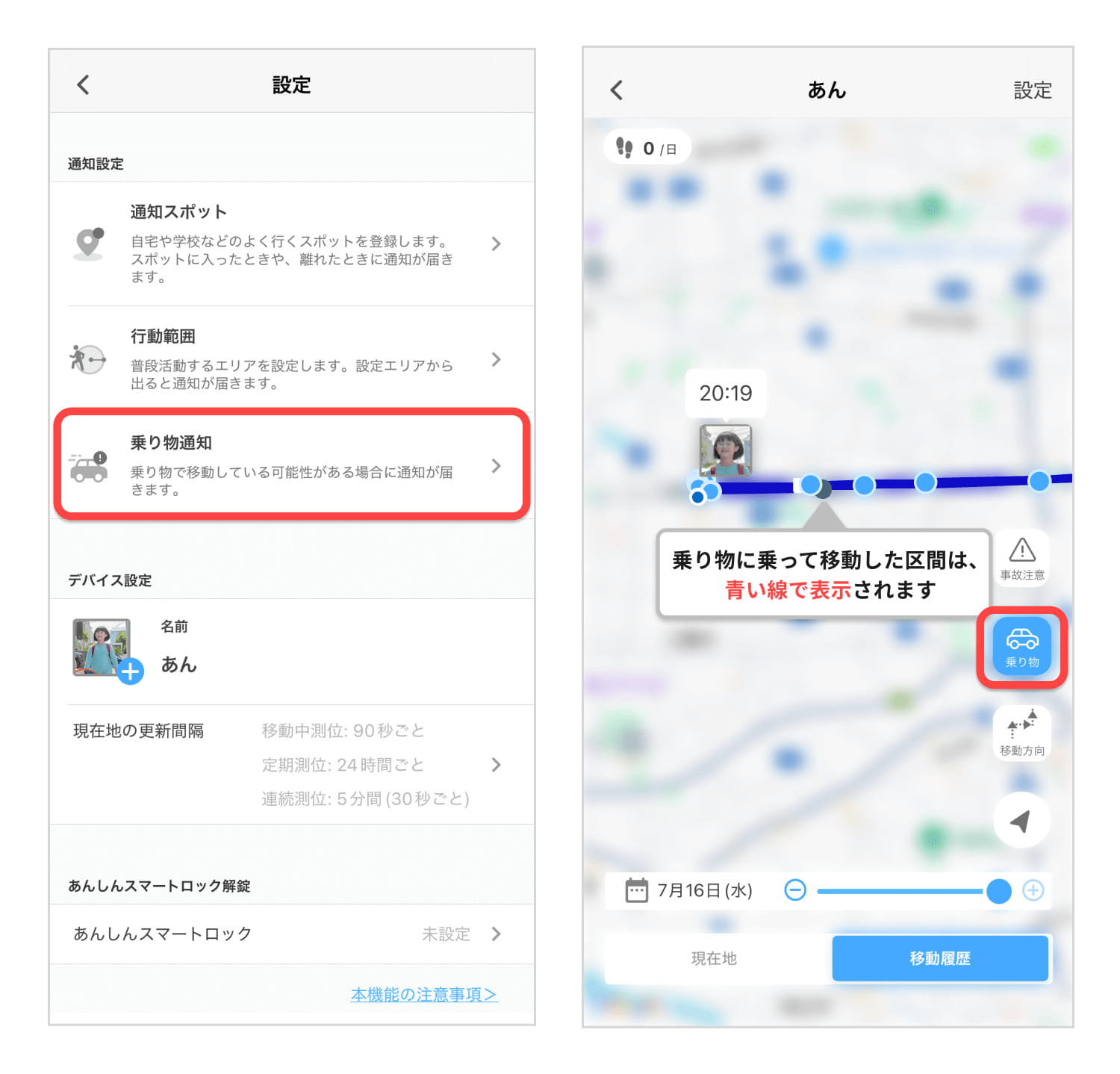 - 乗り物での移動を検知・通知(のりもの通知)