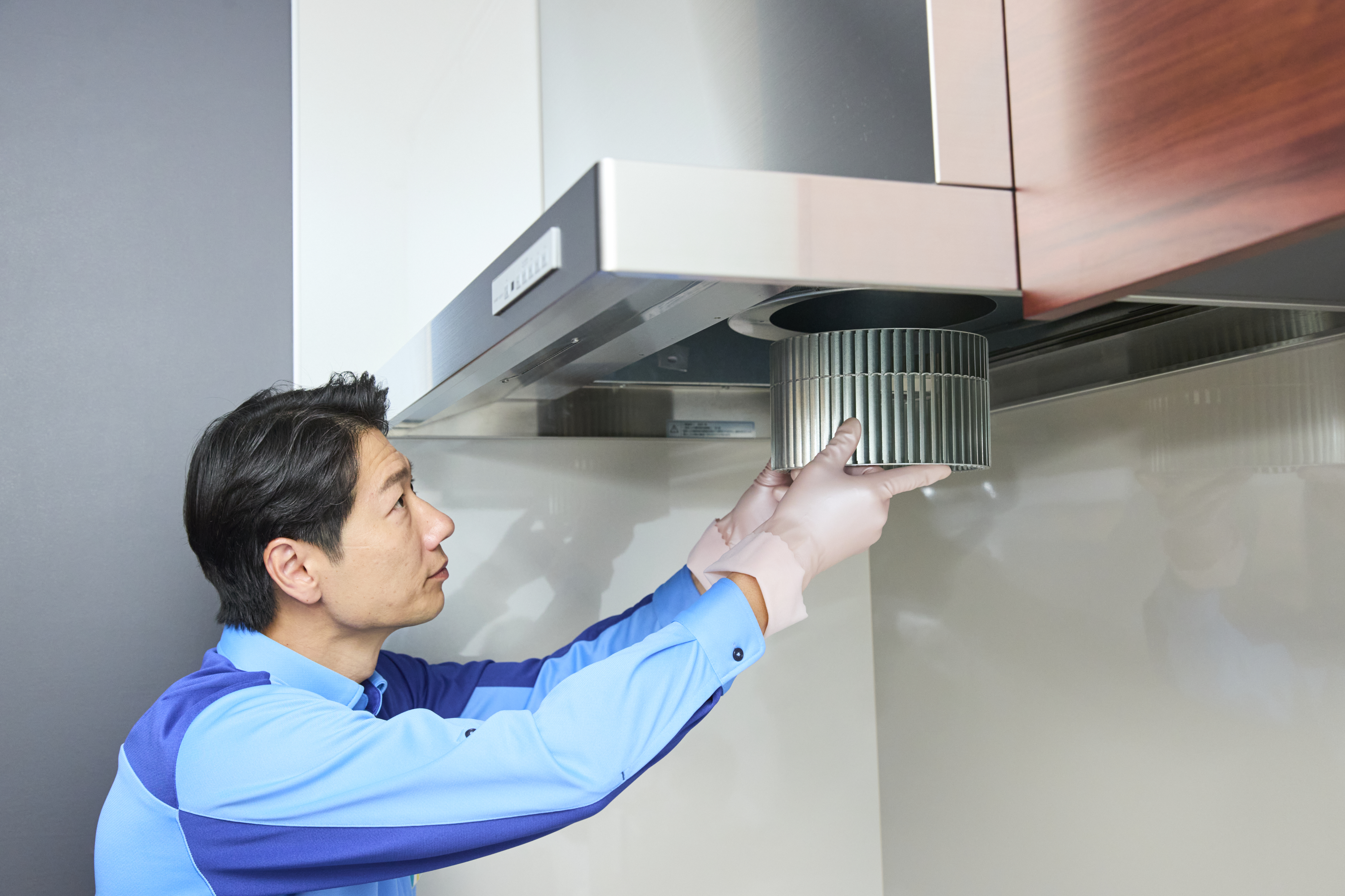 ご家庭でのお掃除が最も難しい場所の一つ。フィルターはもちろん、内部のファンまで分解して、こびりついた油汚れを徹底的に洗浄します。