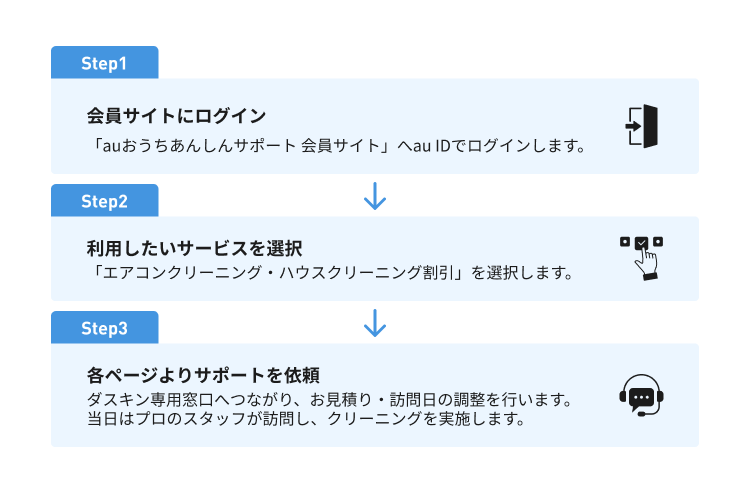 エアコンクリーニング・ハウスクリーニング割引のご利用は、auおうちあんしんサポート会員サイトからご依頼ください。