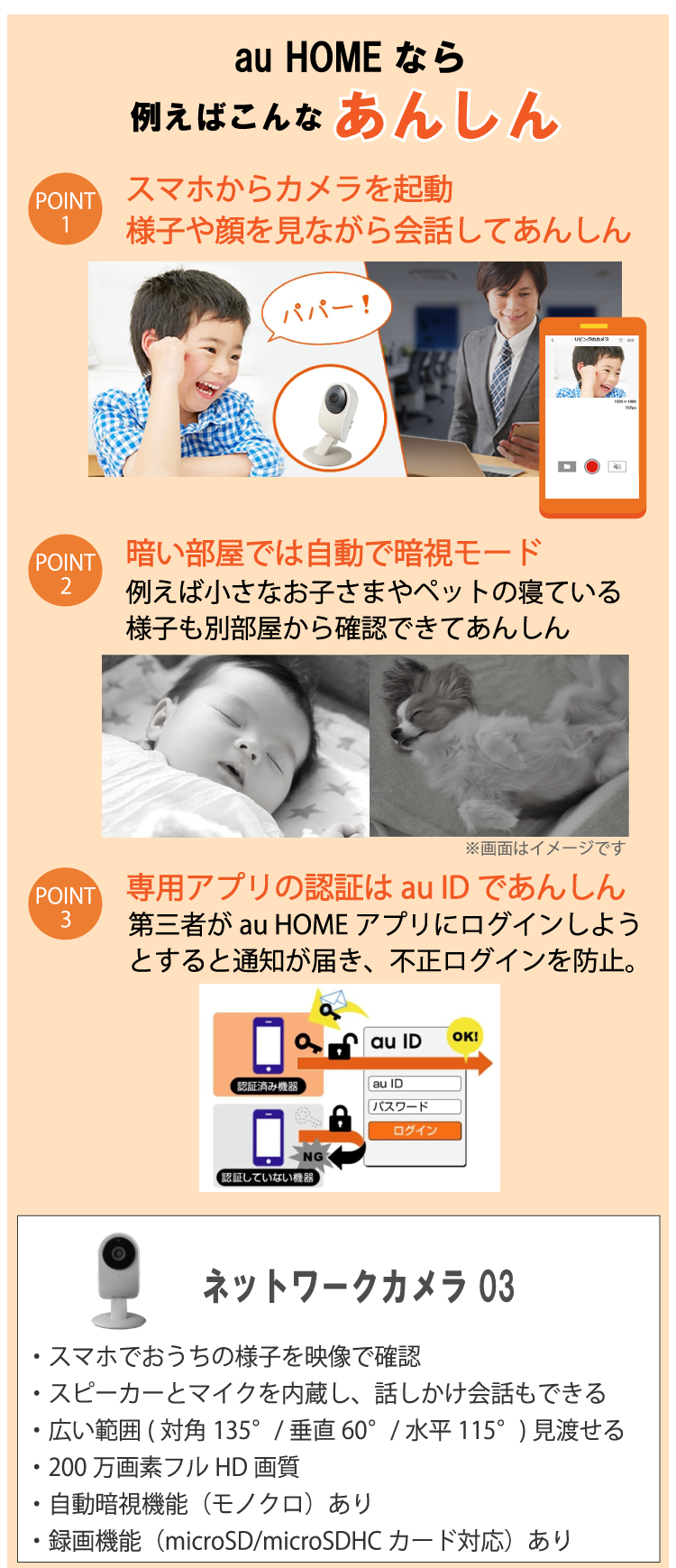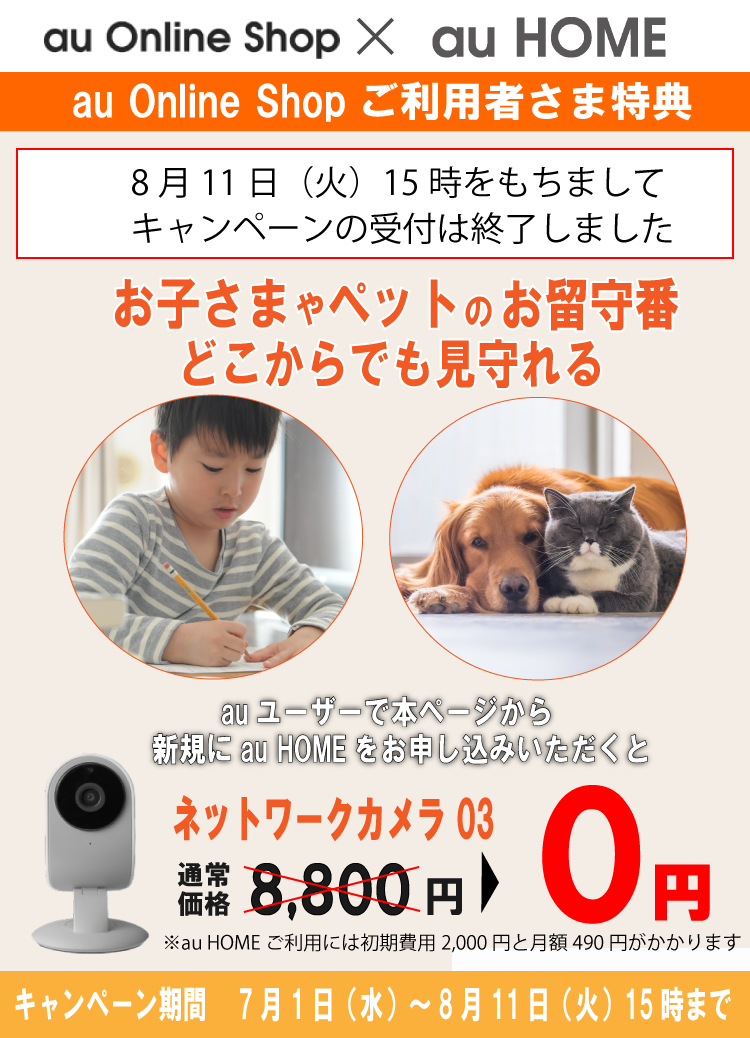 au HOME(基本プラン)をお申し込みいただくと、「ネットワークカメラ 03」(通常価格8,800円)のデバイス代金が0円