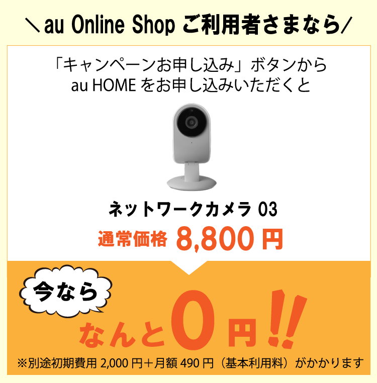 ※au HOME基本プランとは、au HOME基本利用料(月額490円)をお支払いいただき、別途お好きなau HOMEデバイスを購入いただくプランです。本キャンペーンでは、ネットワークカメラ 03がセットになります。別途初期費用2,000円がかかります。